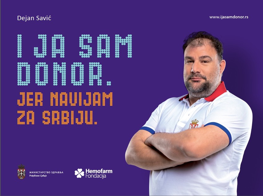 Kako bi doprineli povećanju broja donora, Ministarstvo zdravlja i Hemofarm fondacija na Nacionalni dan donora koji se obeležava danas, 6. juna, pokreću novu kampanju "I ja sam donor. Jer navijam za Srbiju". Vraćanje teme donorstva u prvi plan izuzetno je važno jer u Srbiji oko 1.000 ljudi čeka na transplantaciju organa. Iako su domaći stručnjaci mogu da pariraju svetskoj praksi, broj donora je nedovoljan, a liste čekanja sve duže. Ovoga puta u utakmicu za život uključili su se oni kojima je sportska trka najpoznatija, oni koji ne odustaju ni kada je najteže, a za najbolji rezultat bore se do poslednjeg momenta. Šampionski tim u borbi za život čine Ivana Španović, Maja Ognjenović, Dejan Stanković, Dejan Savić, Branko Lazić, Dragan Škrbić, Zoran Tošić, koji zajedno poručuju: "U ovoj igri svi smo deo istog tima. Snaga je u nama. Jer jedino zajedno stižemo do cilja. I ja sam donor. Jer navijam za Srbiju".