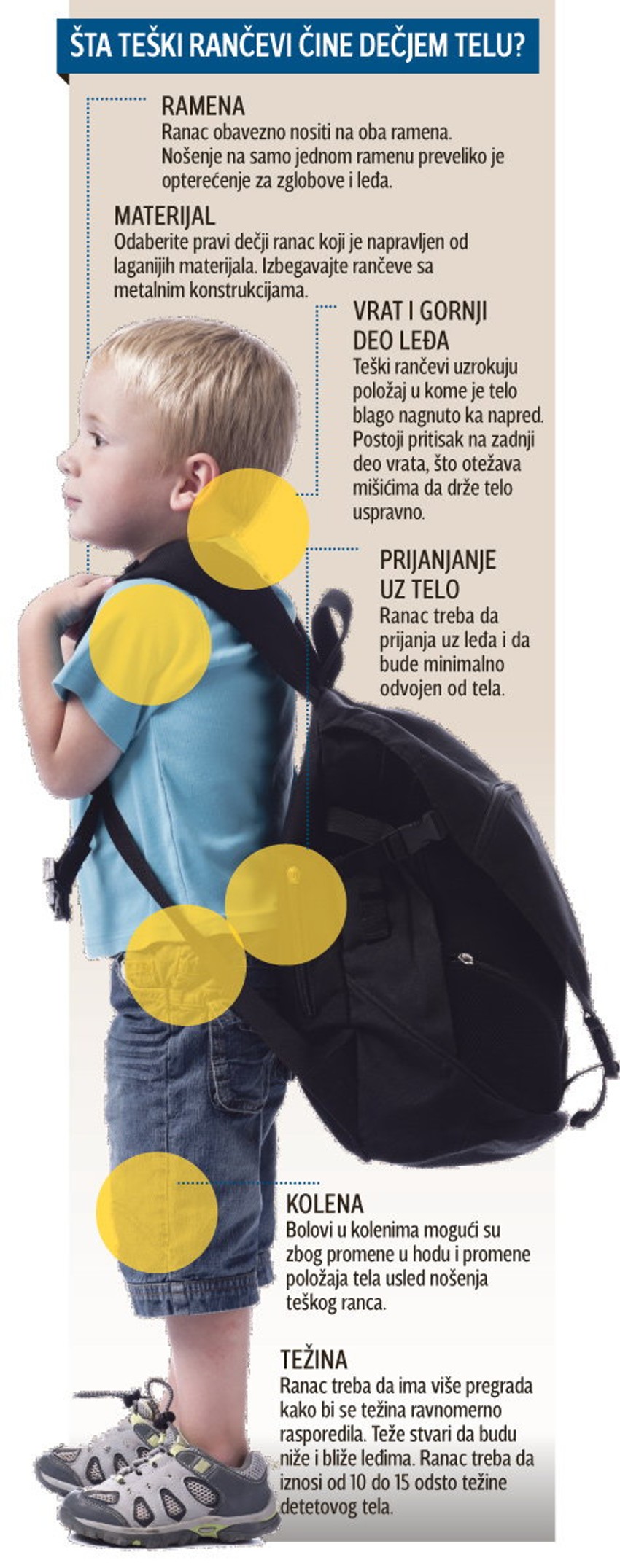 - Izbegavajte ruksake sa metalnim konstrukcijama. Podsetite decu da treba da sede pravih leđa i da noge drže tako da su im stopala celom površinom na podlozi. Nikako ne treba da se naslanjaju na lakat dok pišu - savetuje fizioterapeut Olivera Popović.