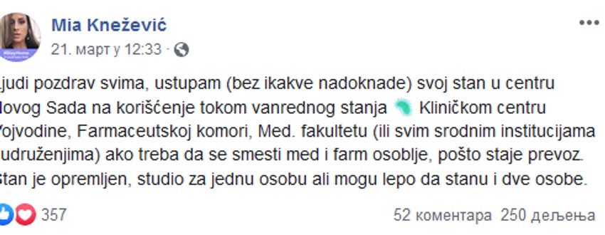 - Ljudi pozdrav svima, ustupam (bez ikakve nadoknade) svoj stan u centru Novog Sada na korišćenje tokom vanrednog stanja Kliničkom centru Vojvodine, Farmaceutskoj komori, Medicinskom fakultetu (ili svim srodnim institucijama i udruženjima) ako treba da se smesti medicinsko i farmaceutsko osoblje, pošto staje prevoz. Stan je opremljen, studio za jednu osobu ali mogu lepo da stanu i dve osobe - napisala je rediteljka na fejsbuku.