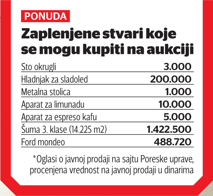 U tom slučaju izvršitelj organizuje javnu licitaciju. Tako su se, primera radi, na sajtu Poreske uprave našli oglasi za prodaju tri okrugla stola po ukupnoj ceni od 9.000 dinara, 10 metalnih stolica koje su 10.000 dinara, za koliko se nudi i aparat za limunadu, dok je aparat za espreso kafu upola jeftiniji.