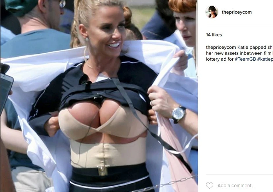 Naime, Kejti su paparaci uspeli da fotografišu dok je snimala reklamu za jedan britanski brend, i to u momentu dok je bezuspešno pokušavala da navuče majicu preko svojih ogromnih grudi.