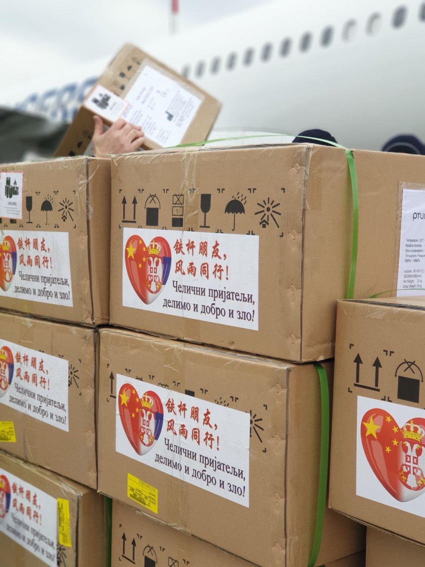 Na paketima medicinske pomoći koja je stigla iz Kine ispisano je, na kinsekom jeziku i ćirilici, "Čelični prijatelji, delimo i dobro i zlo!, uz srce na čijoj jednoj polovini je zastava Srbije, a na drugoj zastava Kine. U Srbiju je, kako je ranije najavljeno, sa medicinskim timom doputovalo šest vrhunskih epidemiologa i njihovo iskustvo biće od velikog značaja za lekare u Srbiji. Podsetimo, još jedan avion Er Srbije, erbas A320, poleteo je jutros u 6. 15 za Šangaj po drugu turu pomoći.