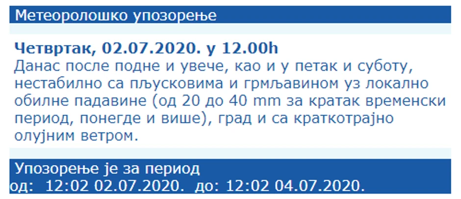 "Prognozirane su opasne vremenske pojave, a takvog su inteziteta da mogu prouzrokovati materijalnu štetu i biti opasne po ljude i životinje. Treba biti vrlo obazriv, svestan rizika i redovno informisan o detaljima očekivanih meteoroloških uslova. Pratiti savete koje daju nadležne državne službe", objašnjeno je na sajtu RHMZ.