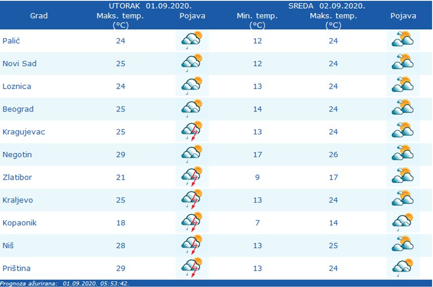 "U naredna dva sata u Vojvodini, centralnoj i jugozapadnoj Srbiji umereno oblačno mestimično sa kišom ili plјuskovima sa grmlјavinom. Do petka u celoj zemlјi svežije sa temperaturama oko prosečnih vrednosti, u većini mesta od 23 do 28 stepeni i ređom pojavom kiše i plјuskova s grmlјavinom", stoji u najavi Republičkog hidrometeorološkog zavoda.