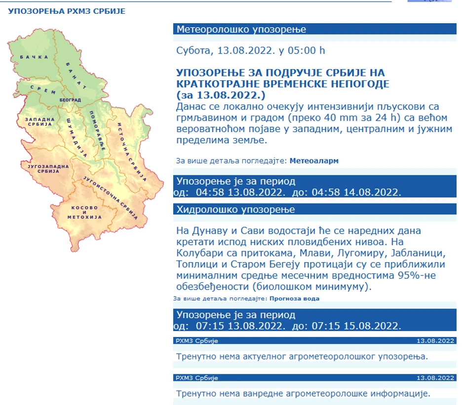 Pored ovog izdato je i hidrološko upozorenje kako će se na Dunavu i Savi vodostaji naednih dana kretati ispod niskih plovidbenih nivoa.
