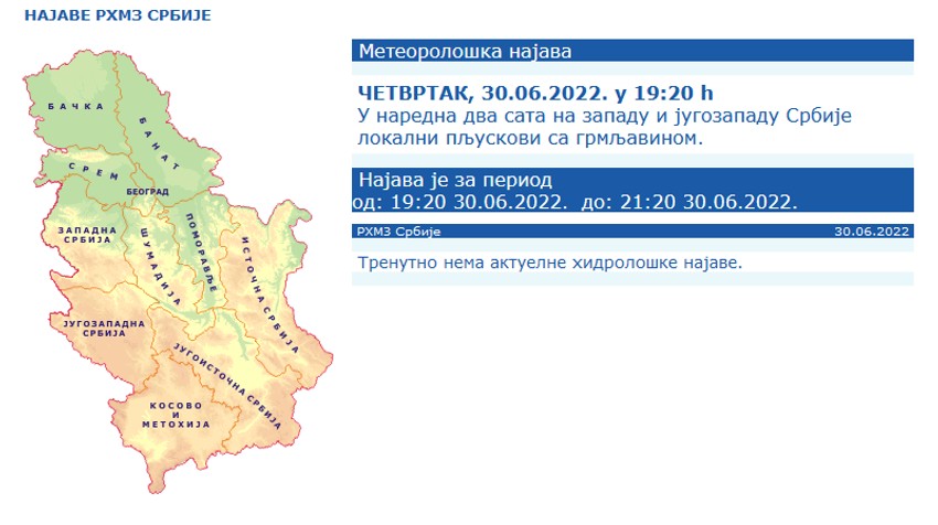 Na zapadu i jugozapadu Srbije u naredna dva sata očekuju se lokalni pljuskovi sa grmljavinom, piše u najnovijoj najavi na sajtu Republičko hidrometeorološkog zavoda.