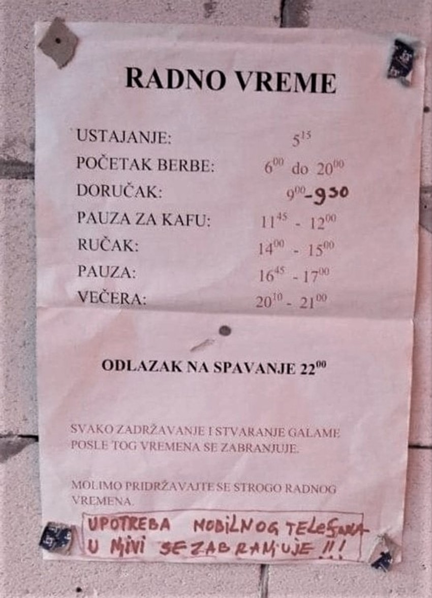 Takođe, na društvenim mrežama kruži i satnica aktivnosti berača, kao i pravila ponašanja, a na osnovu komentara se zaključuje da ih je sastavio upravo neki gazda, malinar. Komentari ispod ove fotografije su veoma burni: dok jedni smatraju da je čovek robovlasnik, drugi kažu da poljoprivreda podrazumeva ozbiljan rad, te da mu se tako mora i pristupiti. Između ostalog, navedena su stroga pravila da se na spavanje odlazi u 22 sata, i da se "svako zadržavanje i stvaranje galame posle tog vremena zabranjuje", kao i da je zabranjena upotreba mobilnog telefona u njivi.