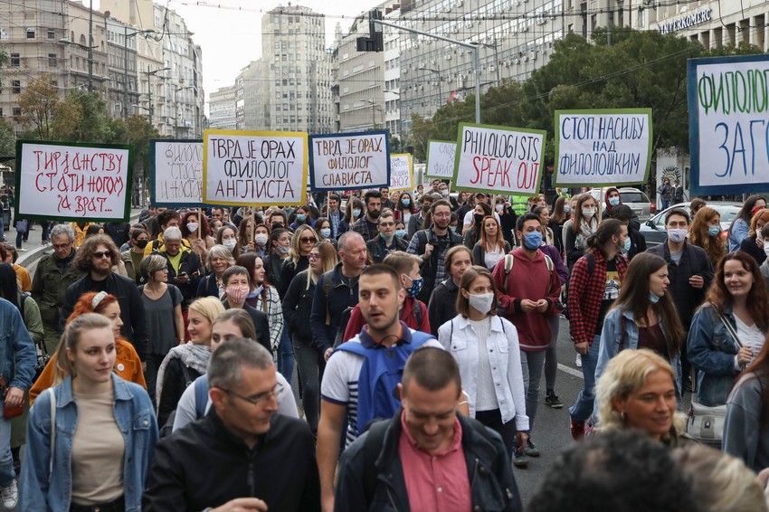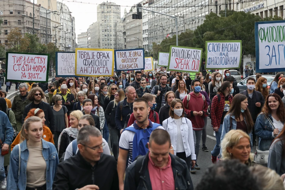 Protesnu šetnju od Platoa ispred Filozofskog fakulteta do Ministarstva prosvete organizovali su danas u 14. sati nastavnici i saradnici Filološkog fakulteta a razlog je, kako navode, "ugrožavanja autonomije Univerziteta i problemi koji su nastali oko izbora novog dekana".