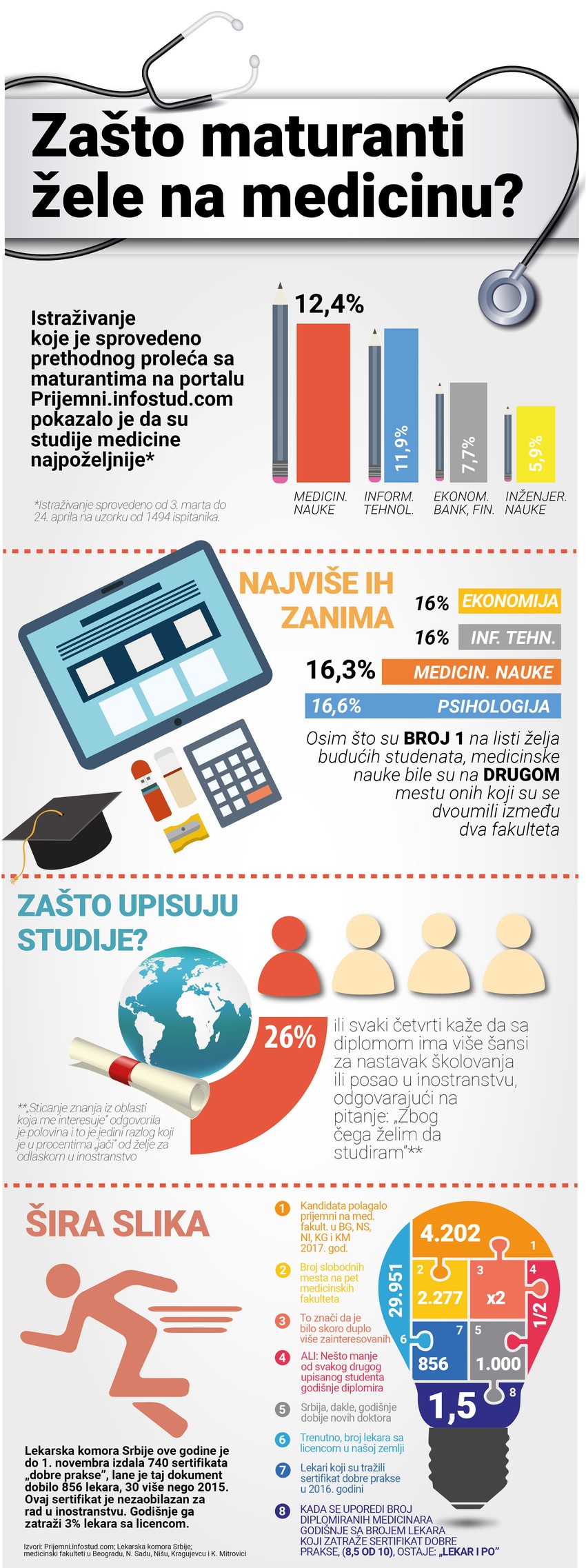 Na prvi pogled, podaci LKS odudaraju od rezultata istraživanja o izboru studija koje je portal Prijemni.infostud.com sproveo među maturantima tokom marta i aprila ove godine, a uoči junskog upisnog roka. Ispostavilo se da je medicina apsolutni broj jedan na listi želja budućih studenata jer je od onih ispitanika koji su znali šta će da upišu, 12,4% imalo “pik” na medicinske nauke. I među onima koji su se dvoumili između dve ili više opcija svega mesec i po pred prijemni, medicina je bila u samom vrhu sa 16,3%, odmah iza psihologije (16,6%).