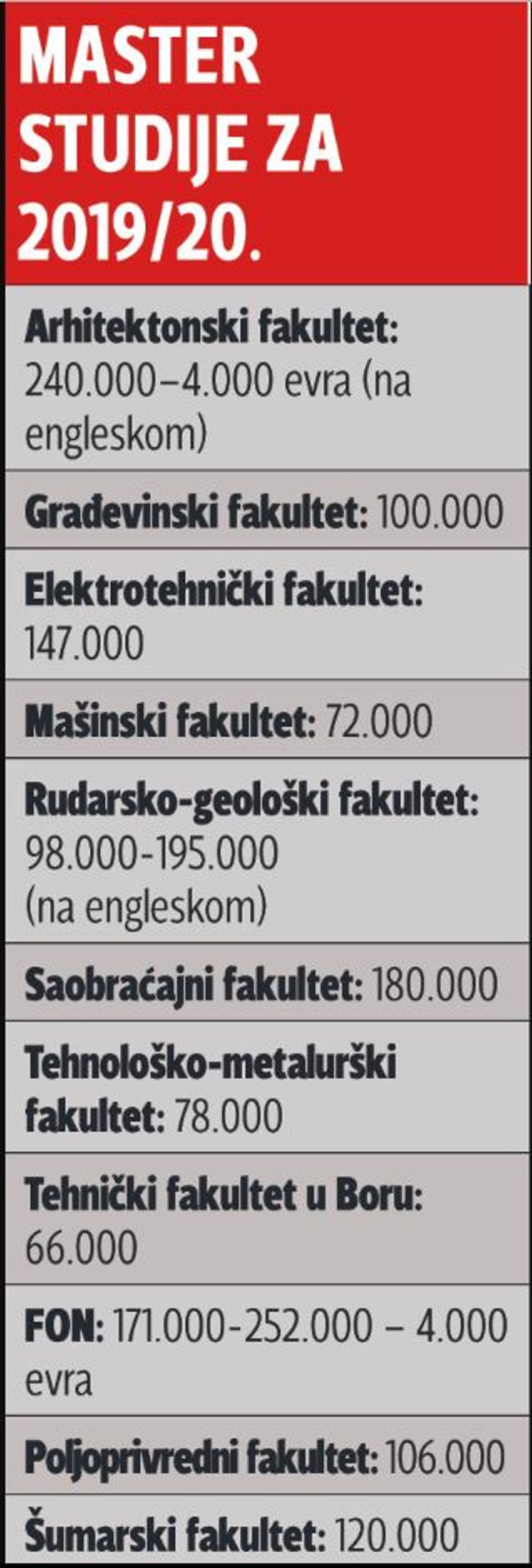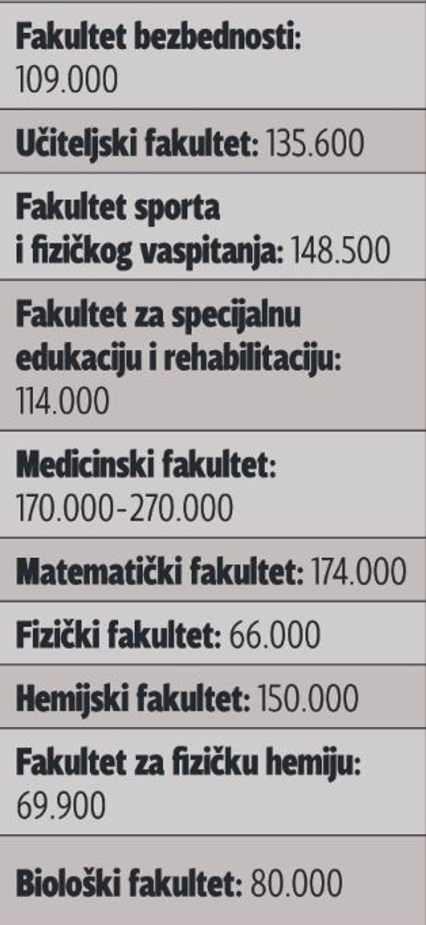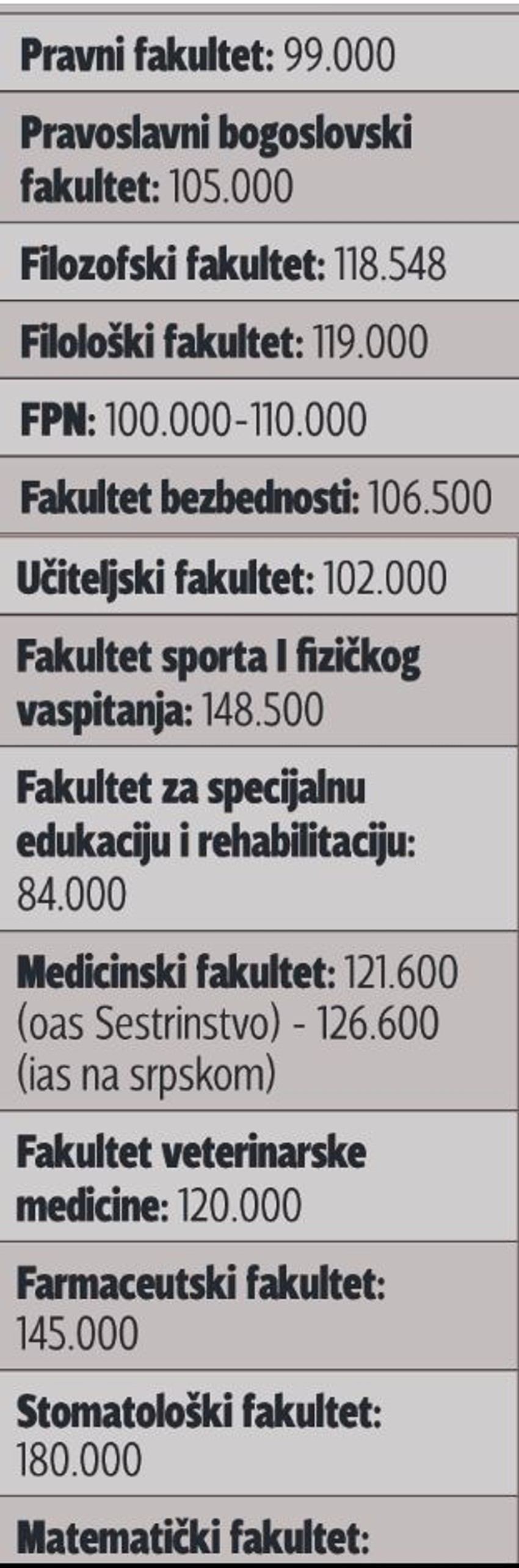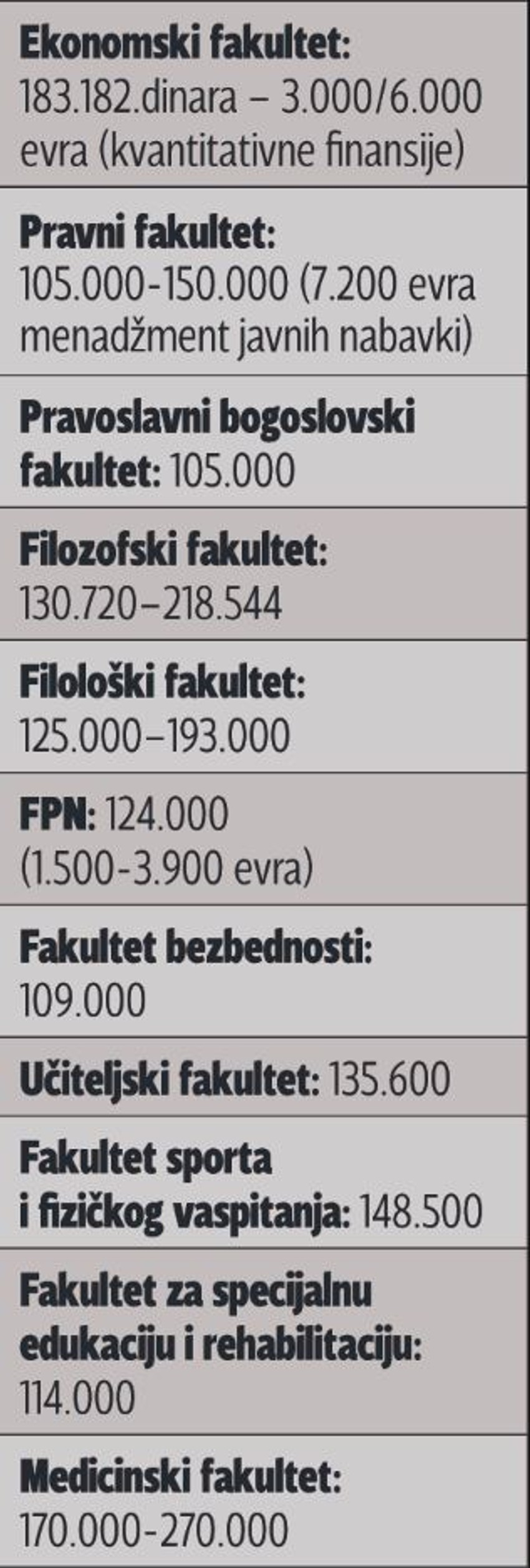Među onima koji drže najnižu cenu školarine je Tehnički fakultet Bor 50.000 dinara, RGF 57.000 dinara, Fizički 60.000 dinara…