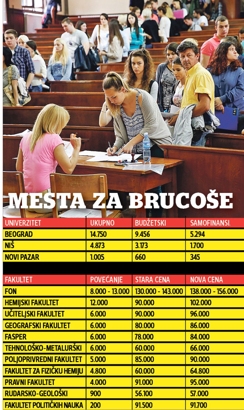 Od 31 fakulteta Univerziteta u Beogradu 11 ih je predložilo više školarine za narednu školsku godinu. Povećanja bi iznosila od 200 dinara, na Fakultetu političkih nauka, pa čak do 13.000 dinara, koliko traže na Fakultetu organizacionih nauka. Fakulteti ovaj predlog uglavnom obrazlažu problemom nadoknade materijalnih troškova i ogromnih računa za grejanje.