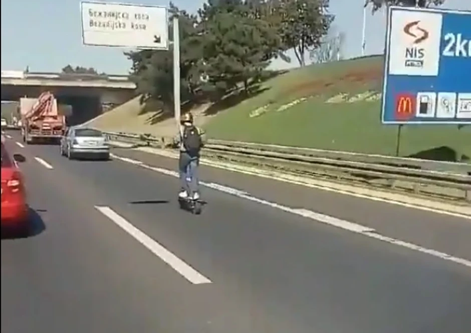 Korisnike društvenih mreža zabezeknuo je snimak mladića, koji nasred auto-puta na Novom Beogradu u smeru prema Šidu vozi električni trotinet.