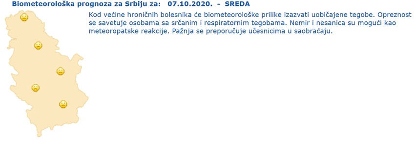 "Kod većine hroničnih bolesnika će biometeorološke prilike izazvati uobičajene tegobe. Opreznost se savetuje osobama sa srčanim i respiratornim tegobama. Nemir i nesanica su mogući kao meteoropatske reakcije. Pažnja se preporučuje učesnicima u saobraćaju", navodi se na sajtu RHMZ.
