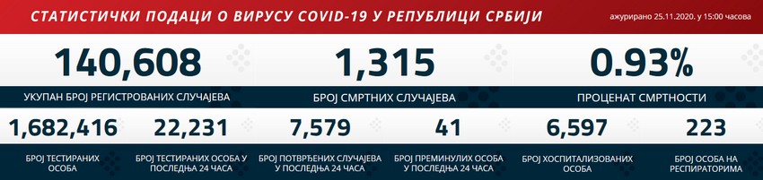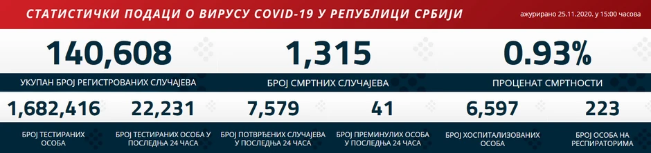 Takođe, povećava se i broj lica na respiratorima, gde je prema poslednjim podacima u bolnicama širom Srbije smešteno njih 223.