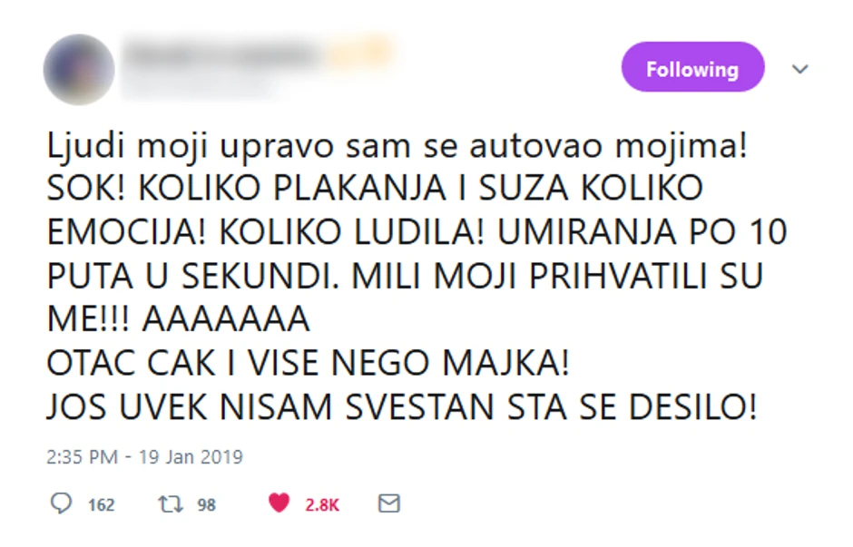 "Ljudi moji, upravo sam se autovao mojima! Šok! Koliko plakanja i suza, koliko emocija! Koliko ludila! Umiranja po sto puta u sekundi. Mili moji, prihvatili su me!!! Otac čak i više nego majka! Još uvek nisam svestan šta se desilo!" napisao je on na tviteru, a nizali su se komentari podrške.