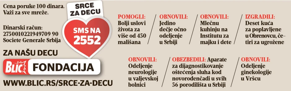 Svi ljudi dobre volje koji žele da pomognu mogu da pošalju SMS na humanitarni broj 2552 ili da uplate sredstva na dinarski tekući račun "Blic fondacije": 2750010221949709 90 ili na devizne račune 10221949724 45 - za uplate u evrima; 10221949711 84 - za uplate u švajcarskim francima, i 10221949717 66 - za uplate u dolarima, Societe Generale Srbija, Beograd.