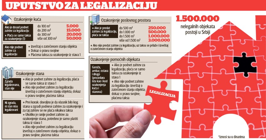 Vlasnici oko 800.000 objekta, čiji vlasnici dosad nisu podneli zahtev za legalizaciju, moraće u svom gradu ili opštini uz plaćenu taksu i dokaz o vlasništvu da podnesu izveštaj o zatečenom stanju sa elaboratom geodetskih radova.