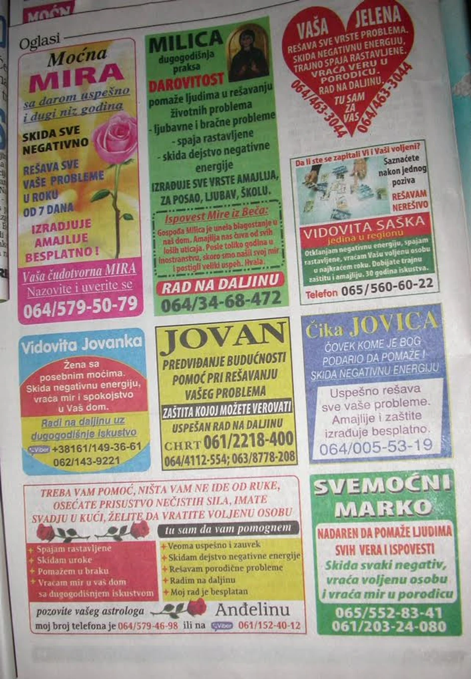 Ovako nam je odgovorila jedna od mnogobrojnih vidovnjakinja kada smo joj se obratili kako bi pomogla "nesrećenoj ženi čiji je muž mnogo nervozan". Kontakt smo našli u oglasima, a ima ga čak i na nekim televizijama, gde se inače bez ikakvog problema reklamira veliki broj raznoraznih vidovnjaka - "Svemoćni Marko", "Vidoviti Janko", razne "vidovite" Rajke, Jece, Cece, Milice...