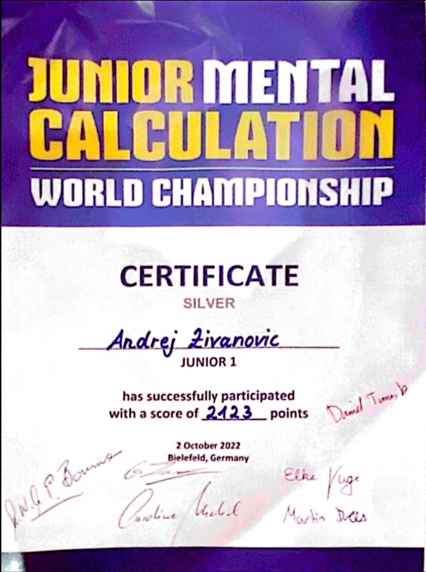 Na Svetskom šampionatu u mentalnom računanju održanom od 30.09. do 02.10.2022. u Bilefeldu, u Nemačkoj drugo mesto i srebrnu medalju osvojio je Andrej Živanović, polaznik škole "Malac Genijalac", desetogodišnjak iz Beograda.