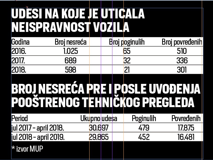 - U 2016. godini neispravnost vozila uticala je na ukupno 1.025 saobraćajnih nesreća u kojima je poginulo 65 ljudi. U 2017. uticala je na 689 nesreća sa 32 poginula. Prošle godine uticaj neispravnosti vozila zabeležen je u 598 saobraćajnih nesreća u kojima je život izgubila 21 osoba - podvlače u MUP-u.