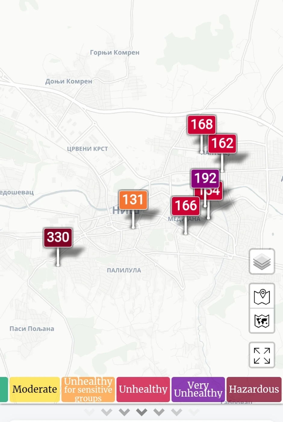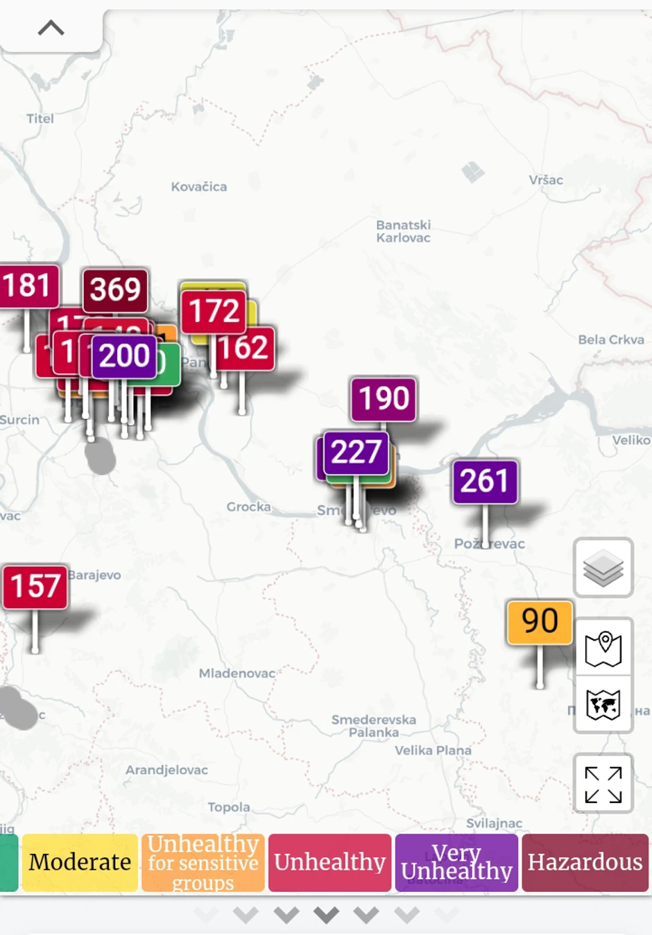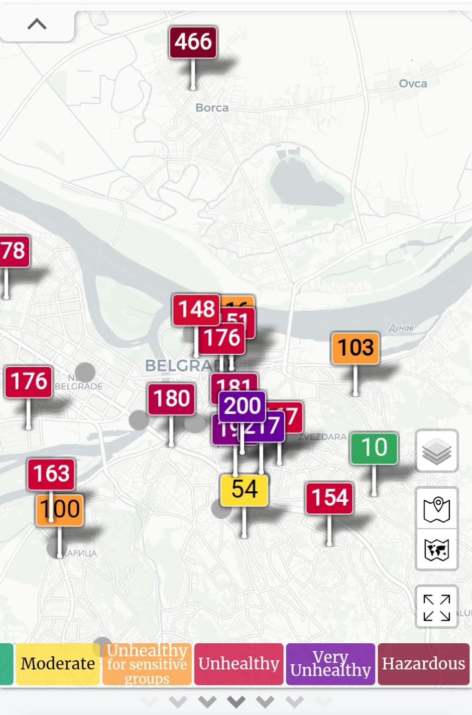 „Opasan“ vazduh udisali su i žitelji Subotice (indeks 406), Šapca (376), Borče (466) i Nišlije na Paliluli (330). U „ljubičarstoj“ zoni, koja po kvalifikaciji sajta Svetsko zagađenje vazduha predstavlja „veoma nezdrav“ vazduh (vrednosti veće od 200), pak, našli su se još Smederevo, Požarevac, Šabac ka Pocerskom Pričinoviću i Vračar u Beogradu.