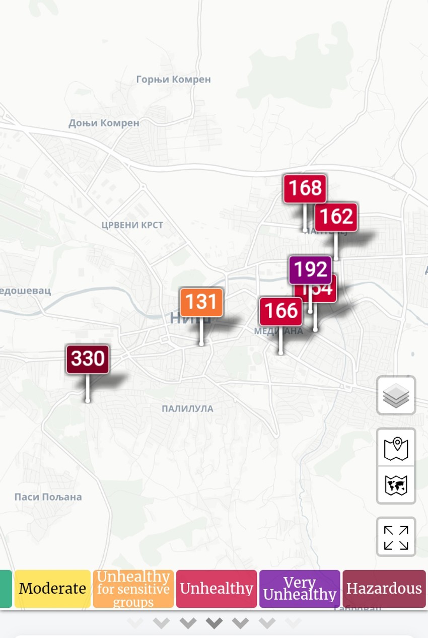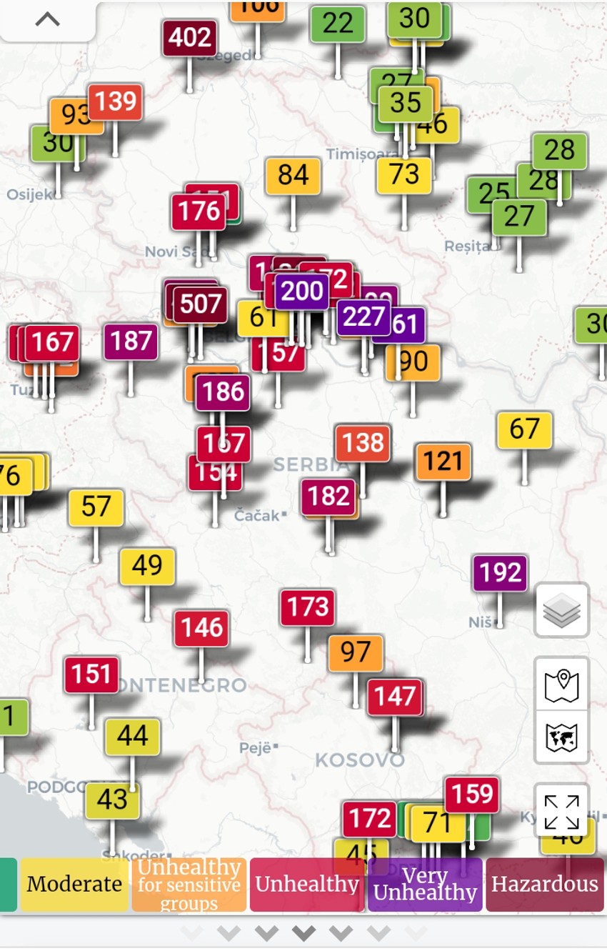 Pogled na mapu Srbije sajta waqi.info tokom prošle noći bio je užasavajući. Jer, pored “crvene”, boje na koju smo praktično “navikli” tokom zime i u koju je “obojena” većina gradova Srbije, po pet mesta u našoj zemlji našlo se i u “ljubičastoj” i čak najgoroj, poslednoj “bordo” zoni.