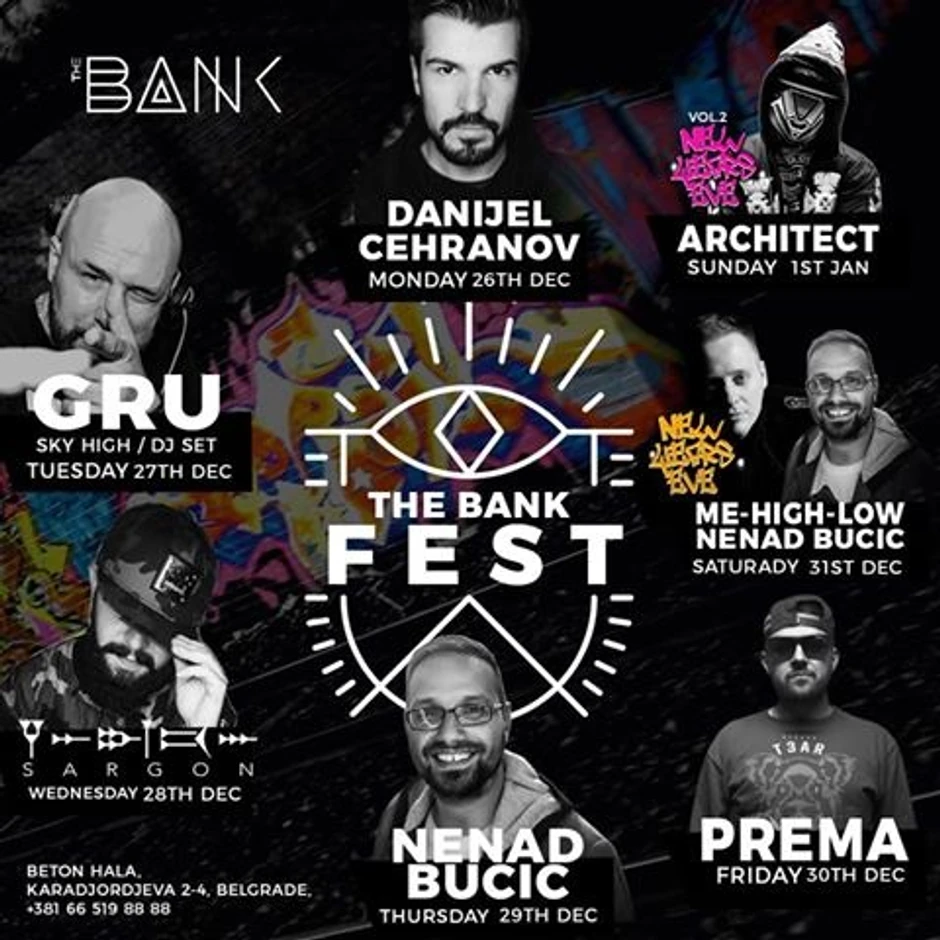 DJ zadužen za spektakularnu noć uoči Nove godine je Me-High-Low, rezident kluba "The Bank", poznat po svojim mashup setovima Funk, Hip Hop, R'n'B i Rap muzike, a njemu će se pridružiti i Nenad Bučić. "Bank Fest" zatvoriće DJ Architect koji ga ujedno i otvara svojom dobro poznatom plejlistom.
