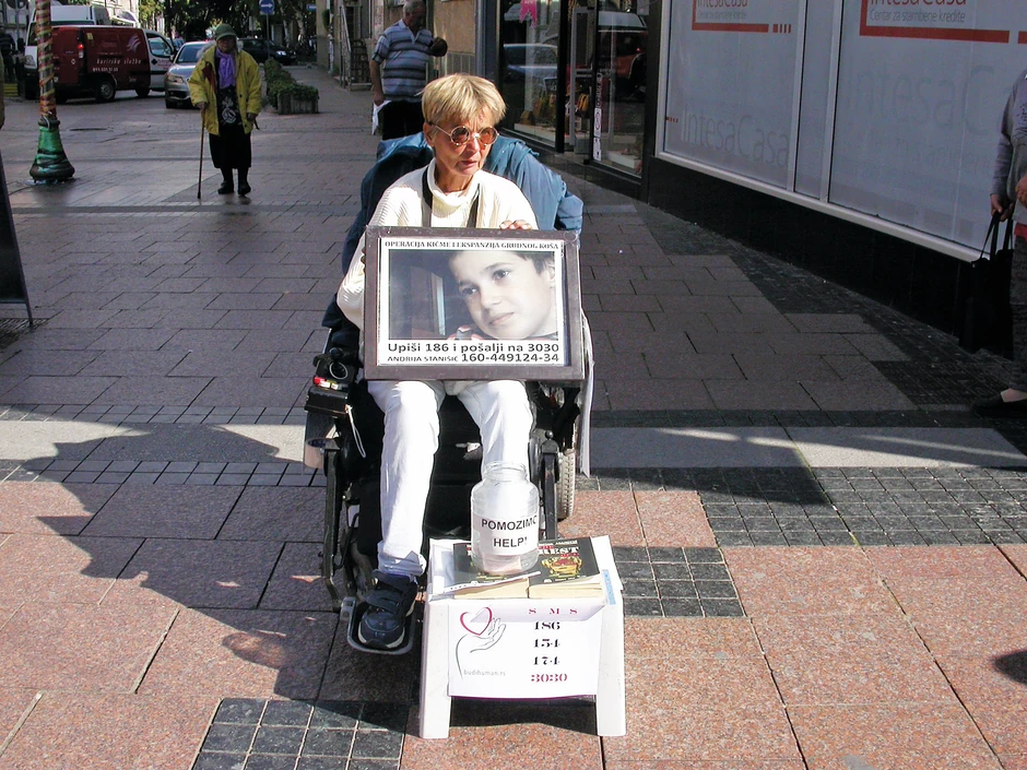 - Pratim, gledam, kome je novac neophodan za lečenje pa onda odštampam transparent, dođem izjutra i čekam. Nedavno je čovek doneo 1.000 evra, što su sakupili i on je odmah uplaćen onome kome treba, jer novac ne zadržavam niti nosim sa sobom, odmah u banku. Trenutno sakupljam za malog Davida Todorova iz Niša koji boluje od celebralne paralize i za Andriju Stanišića koji boluje od kongenitalnog deformiteta kičmenog stuba - počinje priču Marina.