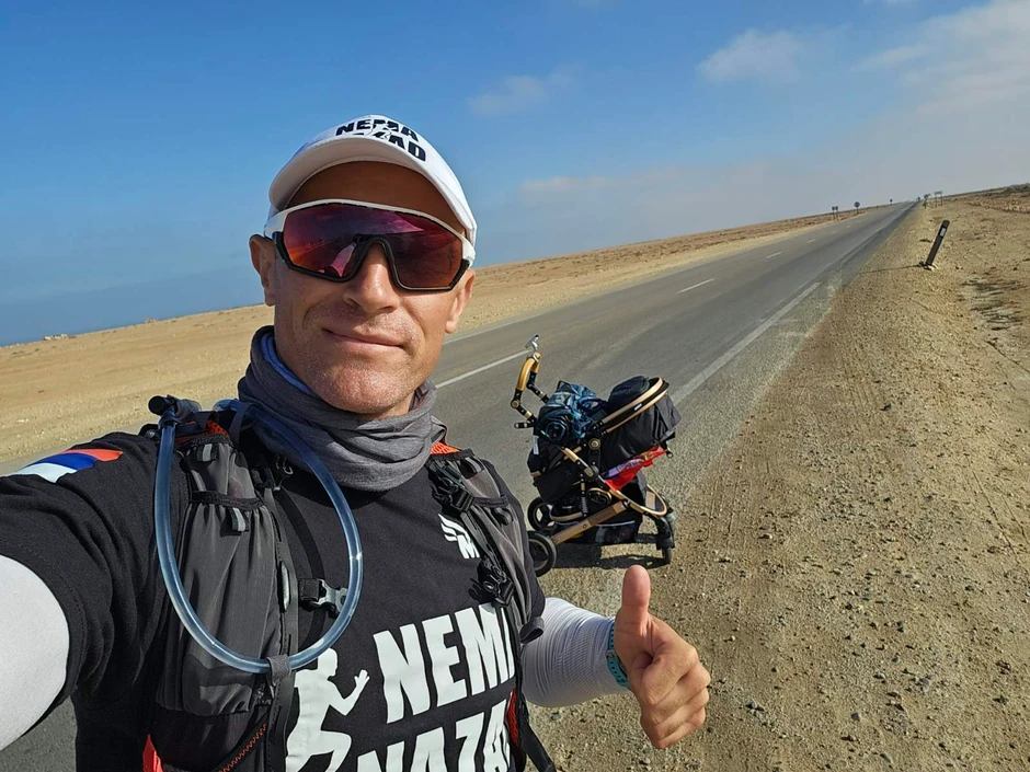 Budući da su Markove stvari oni nosili na biciklima, Marko je našao način kako da sa šatorom i najpotrebnijom opremom nastavi put. Kupio je dečja kolica koja gura dok trči i trčeći hoda putem kroz peščano bespuće.