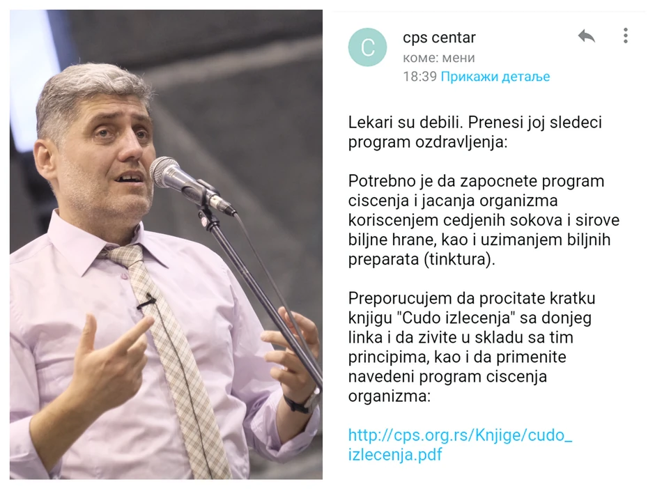 - Brat je prethodnih godinu dana slušao Miroljuba Petrovića i hteli smo da vidimo šta Miroljub ima da nam kaže. Javili smo se putem mejla na njegov CPS centar i priložili mu tetkine rezultate. On nam je na to odgovorio da su lekari debili i preporučio da kupimo njegove tinkture i dovedemo tetku u njegov Institut - dodaje Tanja.