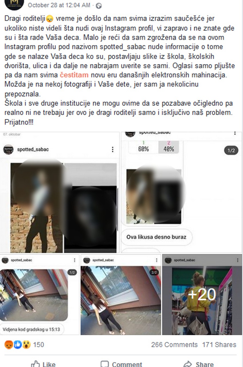 - Dragi roditelji, vreme je došlo da nam svima izrazim saučešće jer ukoliko niste videli šta nudi ovaj Instagram profil, vi zapravo i ne znate gde su i šta rade Vaša deca. Malo je reći da sam zgrožena da se na ovom Instagram profilu pod nazivom spotted_sabac nude informacije o tome gde se nalaze Vaša deca, ko su, postavljaju slike iz škola, školskih dvorišta, ulica i da dalje ne nabrajam uverite se sami. Oglasi samo pljušte, pa da nam svima čestitam novu eru današnjih elektronskih mahinacija. Možda je na nekoj fotografiji i Vaše dete, jer sam ja nekolicinu prepoznala - napisala je zabrinuta majka.