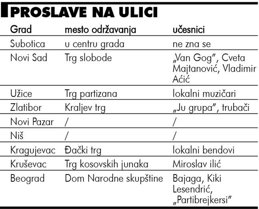 Retki koji će uspeti da dovedu znana muzička imena jesu Kragujevac, u kojem će gostovati „Legende”, na Zlatiboru će nastupiti „Ju grupa”, u Novom Sadu će svirat „Van Gog”, a u Beogradu Bajaga, Kiki Lesandrić i „Partibrejkersi”. U Subotici se najavljuje zabava u gradu, ali je nepoznato ko će nastupati, Apatinu je za sada mnogo 700.000 dinara, koliko košta organizacija dočeka, a Kikinđani su izgubili svaku želju nakon što im je pokradena sva rasveta iz hangara.
