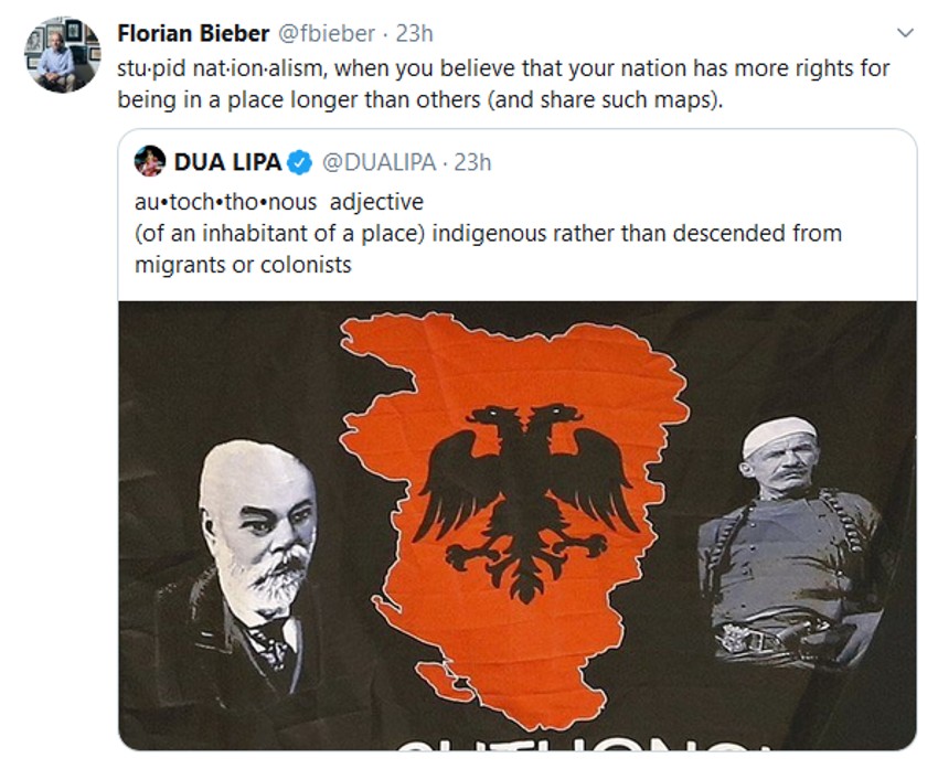 "Verovatno Dua Lipa ne zna, ali ova mapa prikazuje istu vrstu ekskluzivnog i agresivnog nacionalizma kao bilo koja druga. Tvrdnja da jedna grupa ima više prava zato što je tamo bila ranije, nije verodostojna s obzirom na to da su nacije moderne. Mapa, takođe, sugeriše da su na nekoj teritoriji Albanci autohtoni i da imaju vlasništvo nad njom, ali na istoj teritoriji žive i drugi, Srbi, Crnogorci, Grci, Bosanci, Makedonci. Svi oni mogu da tvrde da su podjednako autohtoni", podvukao je Biber.