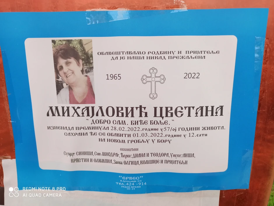 Na umrlici još piše da je žena iznenada preminula 28.februara u 57. godini života a sahrana će biti obavljena 1. marta u 12 sati na Novom groblju u Boru.