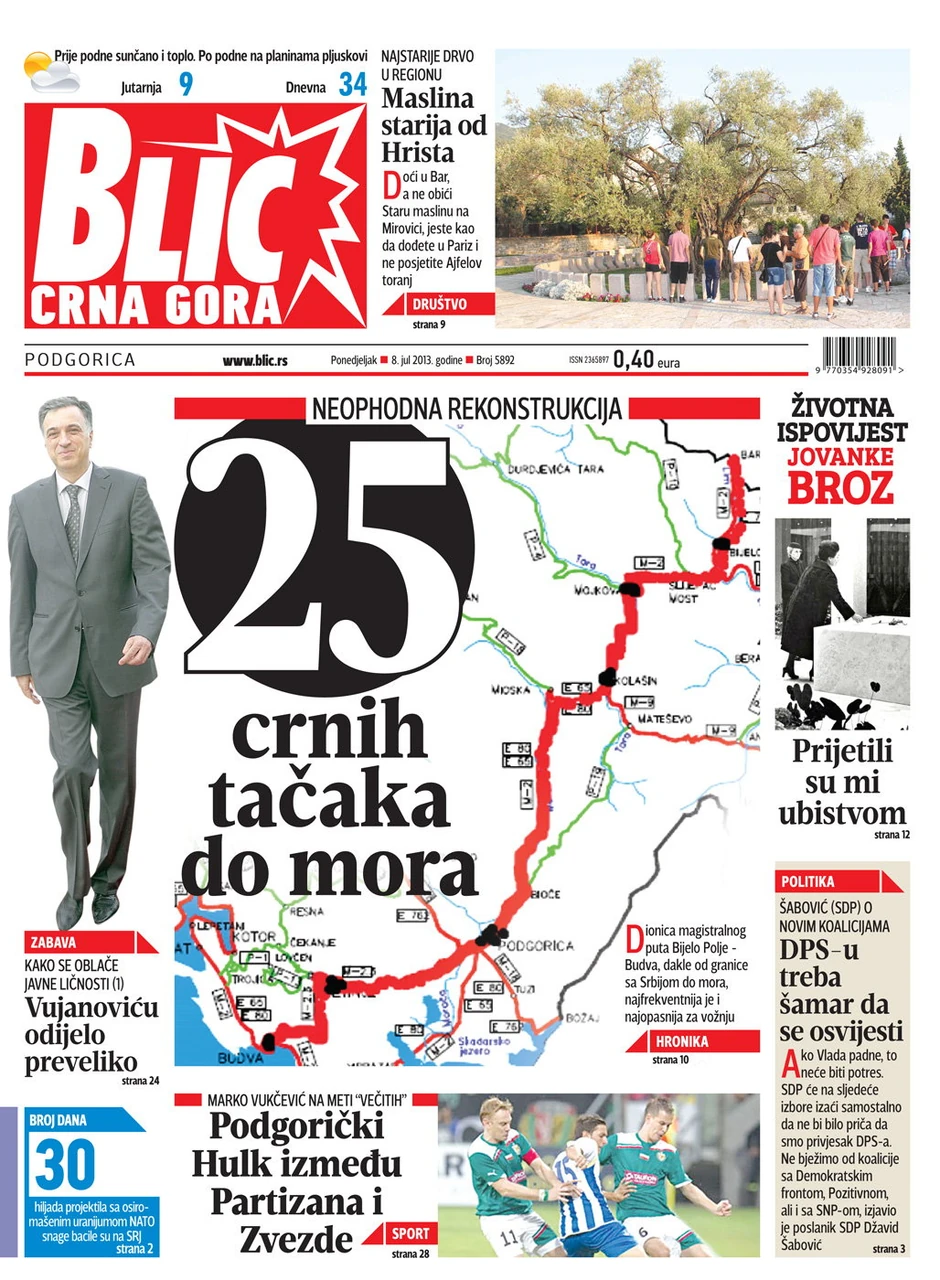 Poslanik SDP Džavid Šabović ocenio je da eventualni pad Vlade neće biti nikakav potres za Crnu Goru, u kojoj su stručnjaci, u međuvremenu locirali ukupno 75 dionica na putevima opasnih po život. Kontrolu goriva obavlja samo Agencija za zaštitu živote sredine i to sa ekološkog aspekta, a na sreću, u Baru je još živa stara maslina.