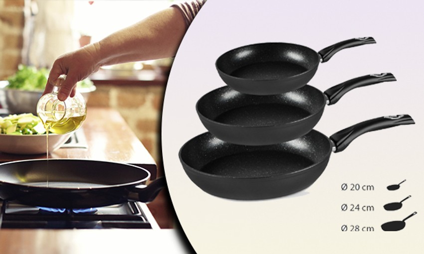 Royalty Line set od 3 tiganja sa mermernim premazom olakšaće vam pripremu omiljenih obroka! Nelepljiva površina zahteva manje masti i ulja u procesu kuvanja, a drške sa mešavinom bakelita i silikona ostaju hladne i pored visokih temperatura. Tiganji dimenzija 20 cm, 24 cm i 28 cm mogu biti vaši za 2.999 dinara samo na gruppi.rs.