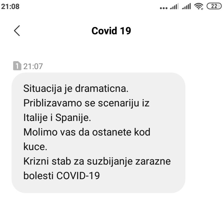 Ova SMS poruka stigla je večeras na mobilne telefone svih građana Srbije. Podatak iz poruke koji uznemirava, o italijanskom i španskom scenariju, očigledno je još jedan u nizu koraka koji Krizni štab preuzima da bi ubedio građane da u manjem broju izlaze na ulice. Koliko je ova strategija uspešna pokazaće dani pred nama.