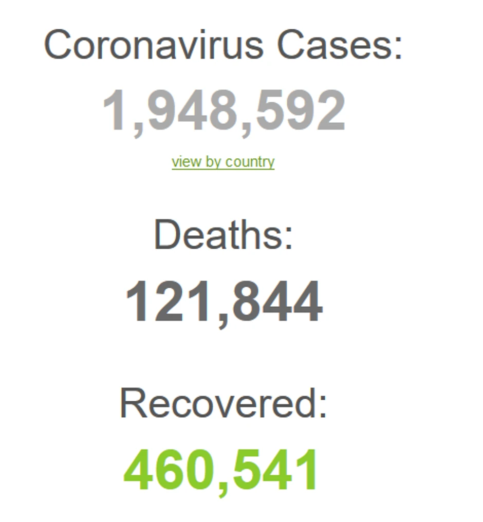 U svetu je korona virusom zaraženo 1.947.534 ljudi, od posledica ovog virusa preminulo je 121.778 osoba, a oporavilo se 460.163 pacijenata, pokazuju najnoviji današnji podaci sa sajta worldometers.info.
