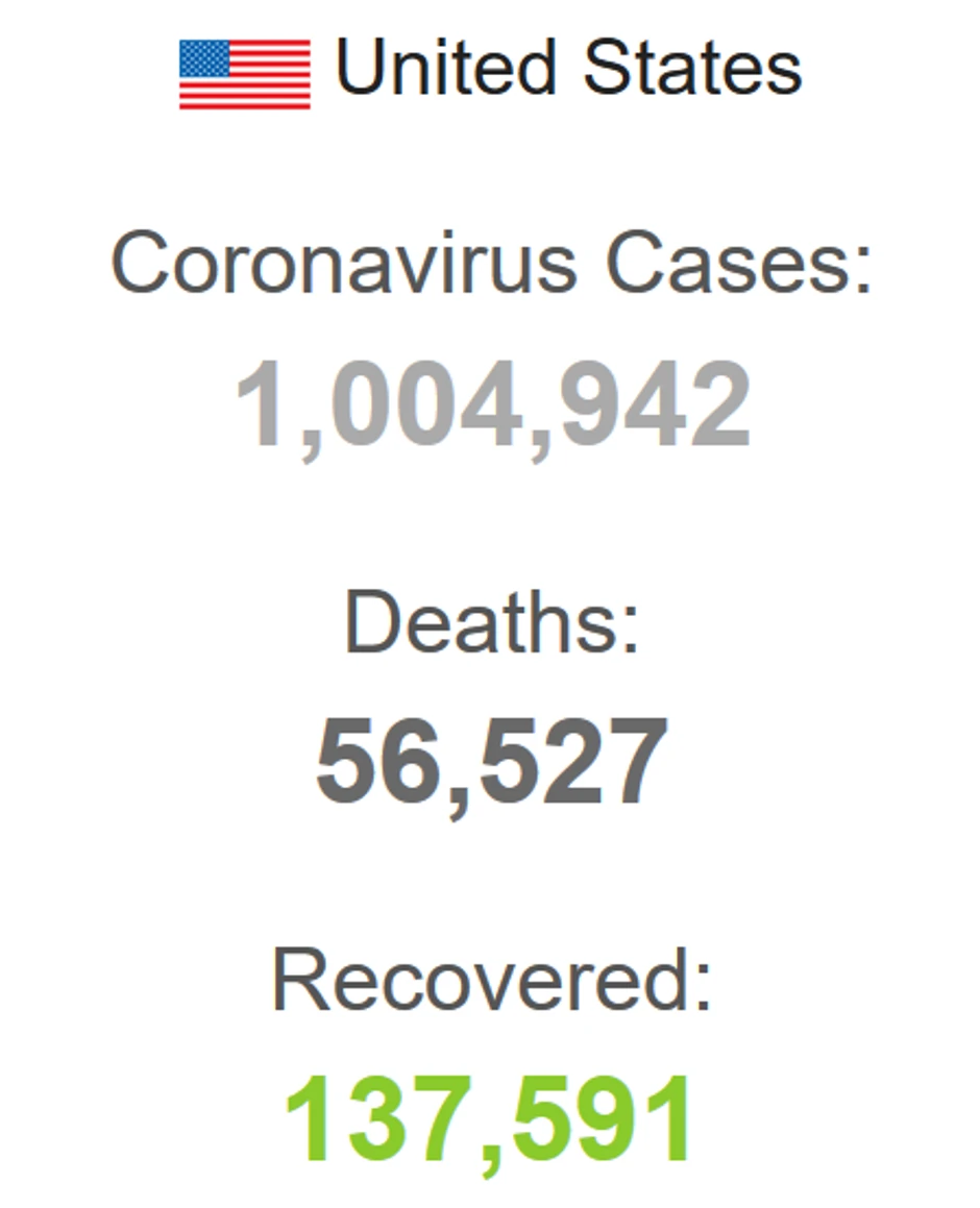 Broj inficiranih korona virusom u Sjedinjenim Američkim Državama premašio je milion. Prema poslednjim podacima sa sajta "Worldometers", broj zaraženih je 1.004.942. Inače, SAD ima ubedljivo najveći broj obolelih u svetu.
