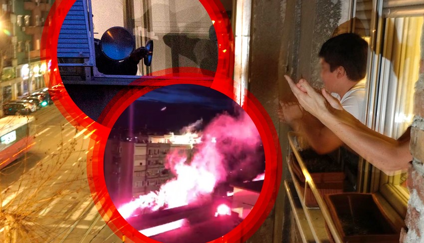 Prvo u 20, pa u 20.05 a onda i u 20.30 - u ovih pola sata sinoć smestilo se sve: podrška medicinskim radnicima, protest protiv protiv aktuelne vlasti, ali i odgovor onih koji je podržavaju. Šerpe, pištaljke, udaraljke, muzika, ozvučenje, petarde, baklje... sve to poslužilo je za svojevrsni "balkonski rat", koji se vodio sa prozora, terasa i dvorišta, ali i na društvenim mrežama, gde nisu prestajali da kruže snimci i jednih i drugih.
