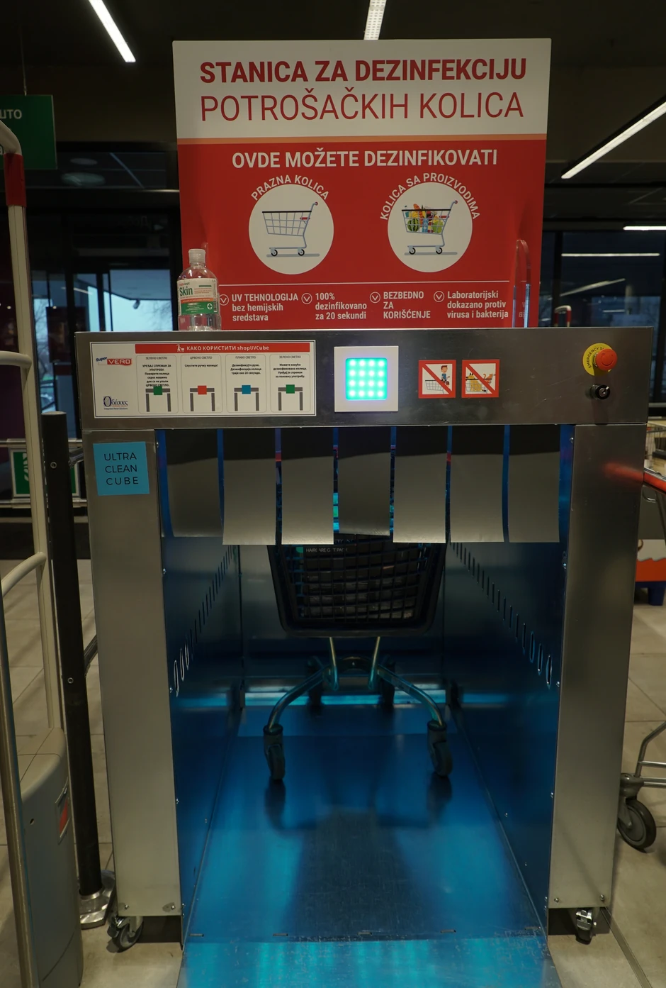 Stanica za dezinfekciju ShopUVCube, do sada je postavljena u Super Vero marketu na Novom Beogradu, a biće postavljena i u marketima na Konjarniku, u Žarkovu i u Ziri.