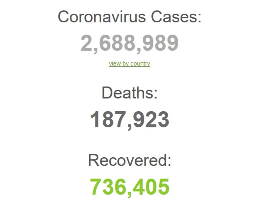 Prema najnovijim podacima sa sajta "Wordlometer", broj slučajeva obolelih od korona virusa do danas iznosi 2.688.989, a preminulih je 187.923 ljudi.