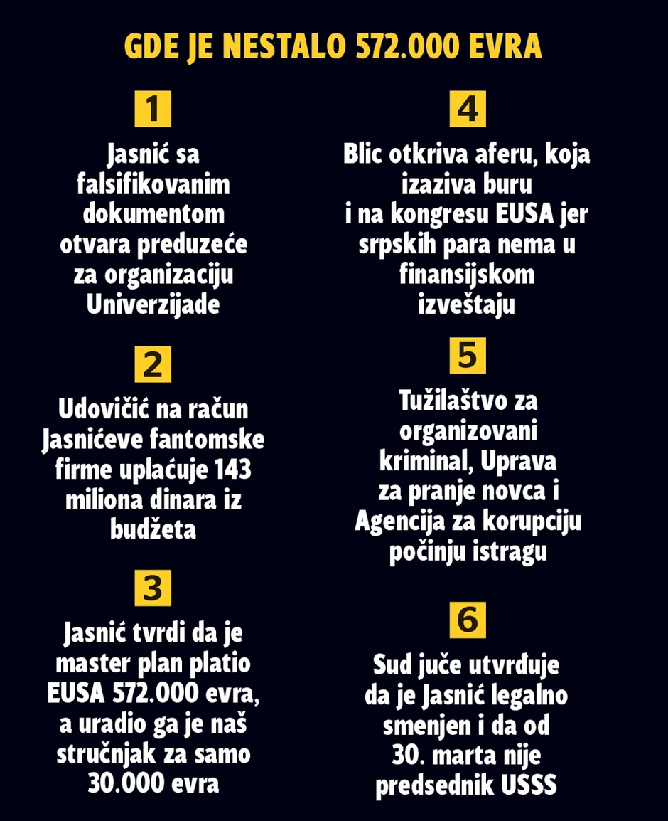 Podsetimo, Jasnić je bez dozvole skupštine USSS formirao preduzeće, na koje je Udovičić uplatio 143 miliona dinara. Jasnić je od toga, navodno, platio EUSA izradu master plana 572.000 evra iako je plan uradio naš stručnjak Srđan Bošković za samo 30.000. Čelnici EUSA, Slovenci Matjaž Pečovnik i Adam Roček, kao ni Jasnić i Udovičić, ne mogu da objasne gde su te pare završile.