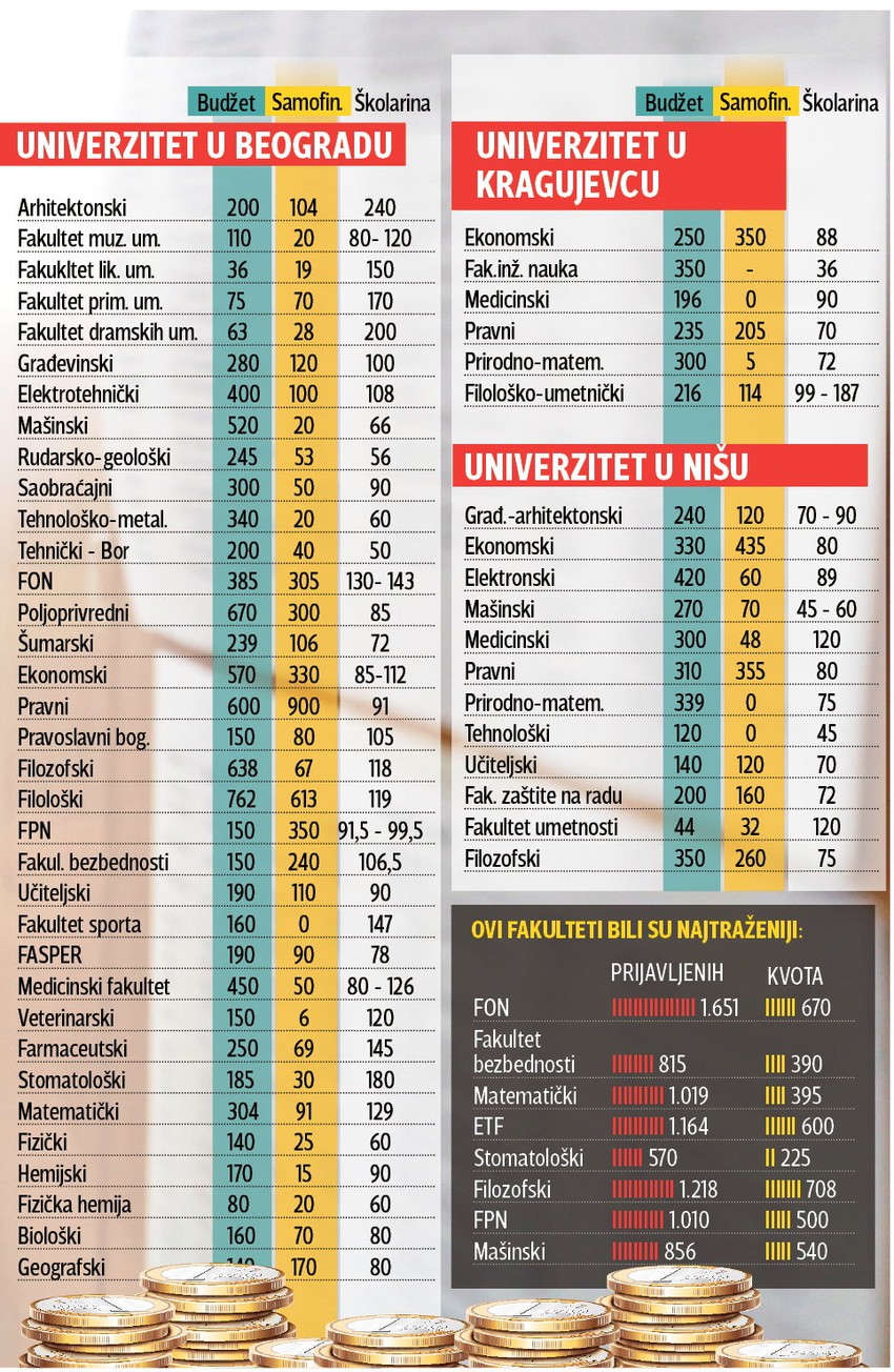 Od 59.000 svršenih srednjoškolaca, državne fakultete moći će da upiše 35.000 brucoša. Oko 22.000 njih imaće priliku da studira o trošku države, dok će ostali za školarine morati da izdvoje od 56.000 do 240.000 dinara