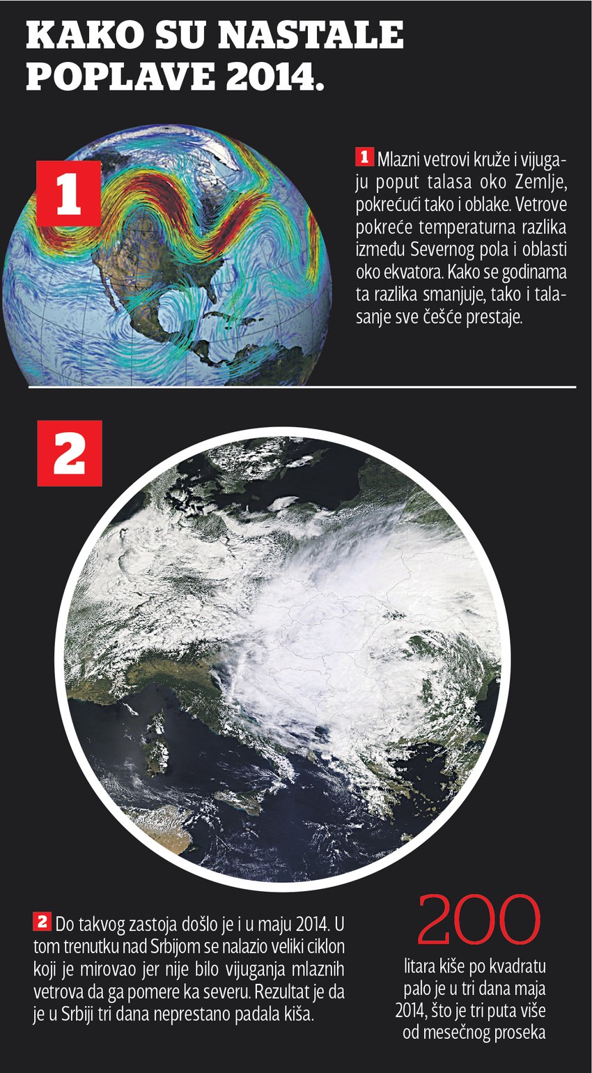 Šta se, zapravo, dogodilo? Prostim jezikom rečeno, iznad Srbije se pre dve godine zaustavio veliki oblak, koji bi u normalnim okolnostima preko Balkana verovatno prošao za jedan dan. Zakazali su, međutim, vetrovi u višim slojevima atmosfere, koji taj veliki ciklon nisu pogurali dalje na sever, već su ga ostavili da tri dana iznad Srbije izručuje ogromne količine akumulirane vode.