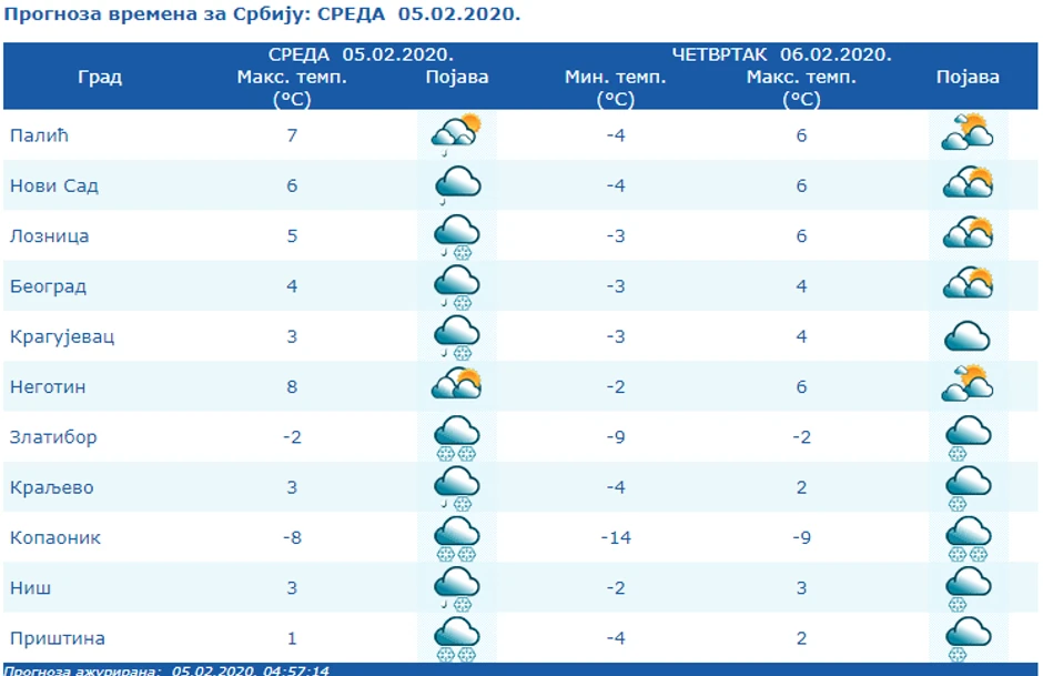 Najniža temperatura od 0 do četiri stepena, najviša od tri do osam.