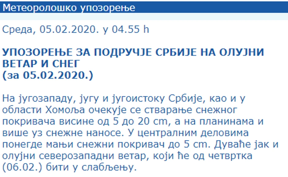 - Na juguzapadu, jugu i jugoistoku Srbije, kao i u oblasti Homolja očekuje se stvaranje snežnog pokrivača visine od pet do 20 centimetara, a na planinama i više uz snežne nanose. U centralnim delovima ponegde manji snežni pokrivač do pet centimetara. Duvaće jak i olujni severozapadni vetar, koji će od četvrtka biti u slabljenju - stoji na sajtu RHMZ.