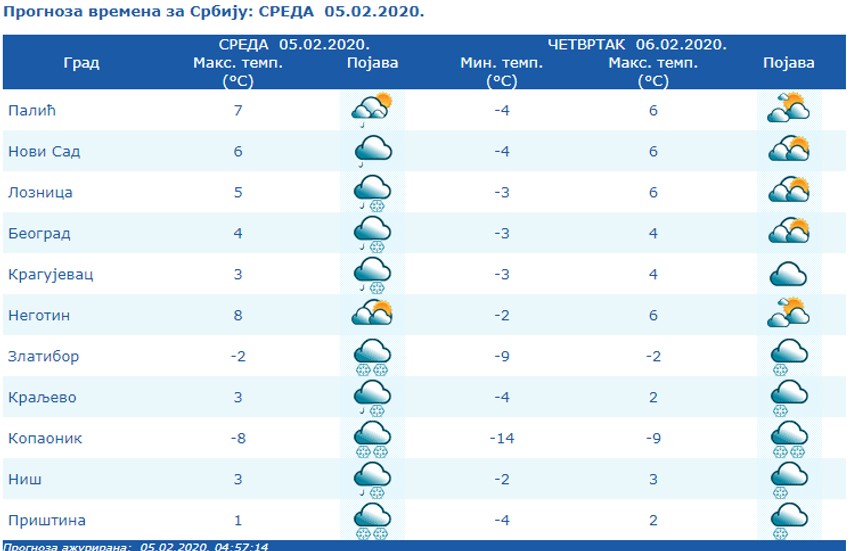 U najavi RHMZ stoji da u toku jutra u nižim predelima mešovite padavine (kiša i sneg), a u brdsko-planinskim sneg i povećavanje visine snežnog pokrivača. Duvaće jak i olujni severozapadni vetar.