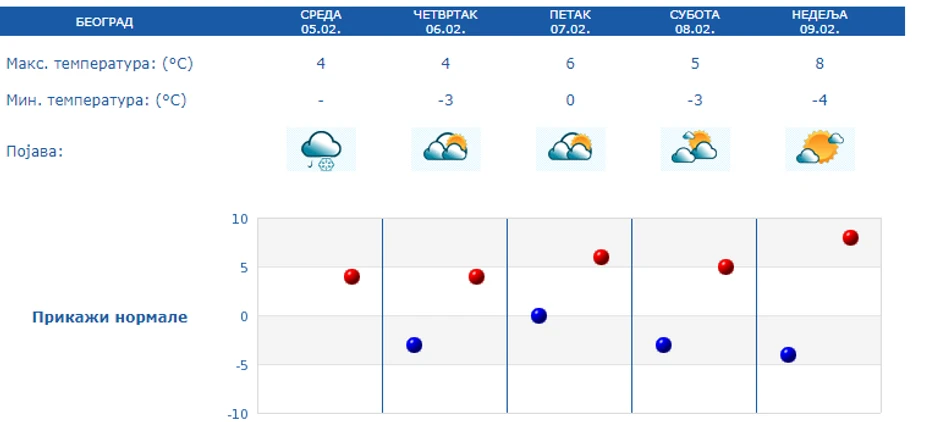 Duvaće jak i olujni severozapadni vetar. Najniža temperatura oko dva, najviša dnevna oko pet stepeni.