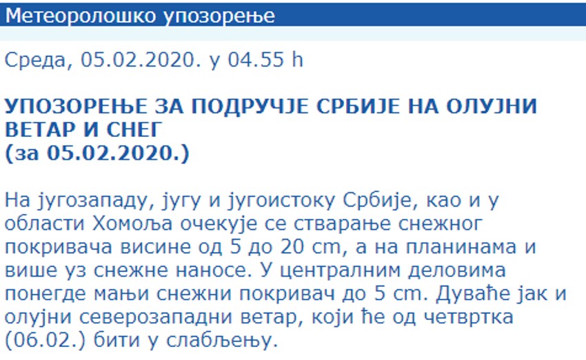 Na sajtu Republičkog hidrometeorološkog zavoda objavljeno je upozorenje za područje Srbije na olujni vetar i sneg.